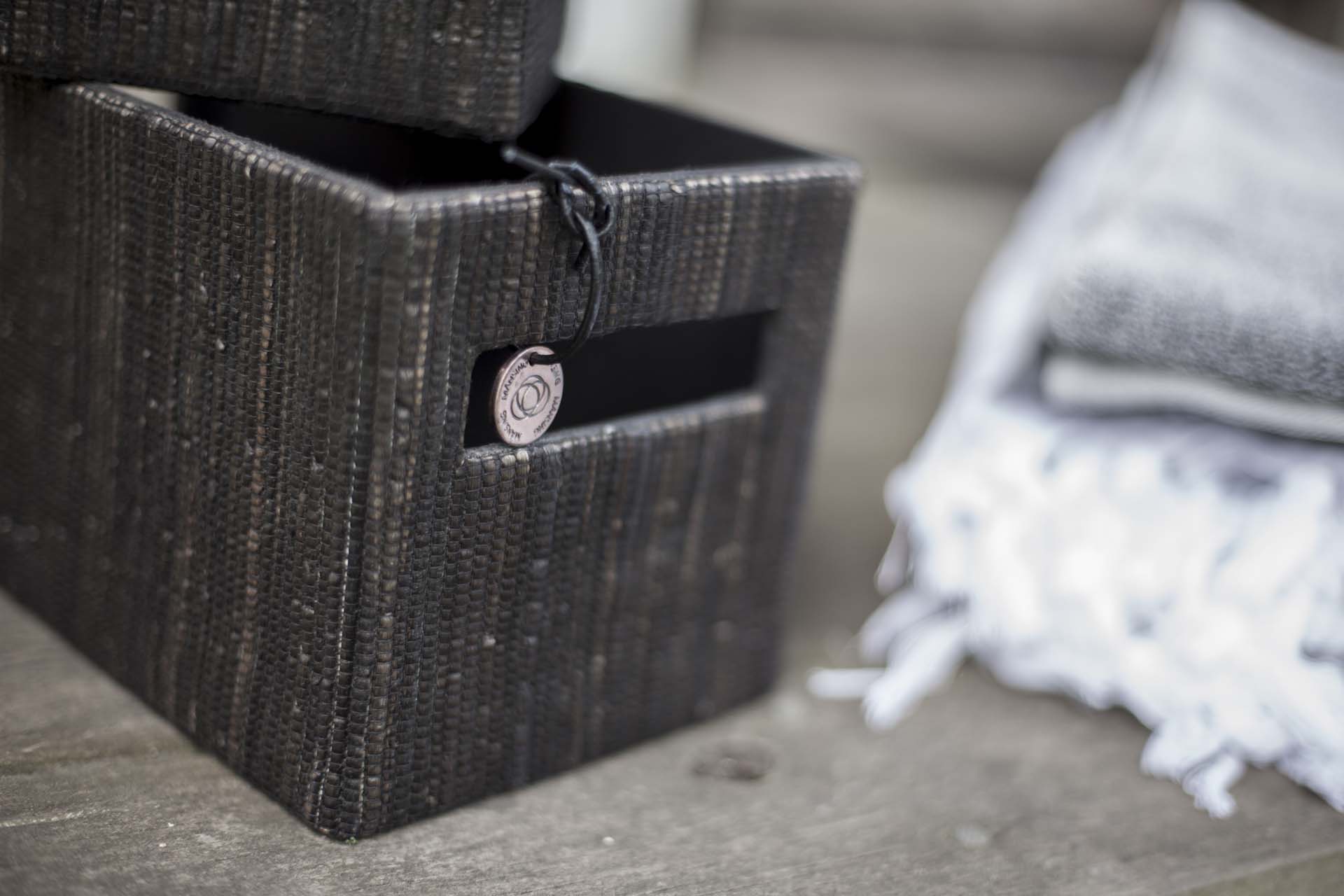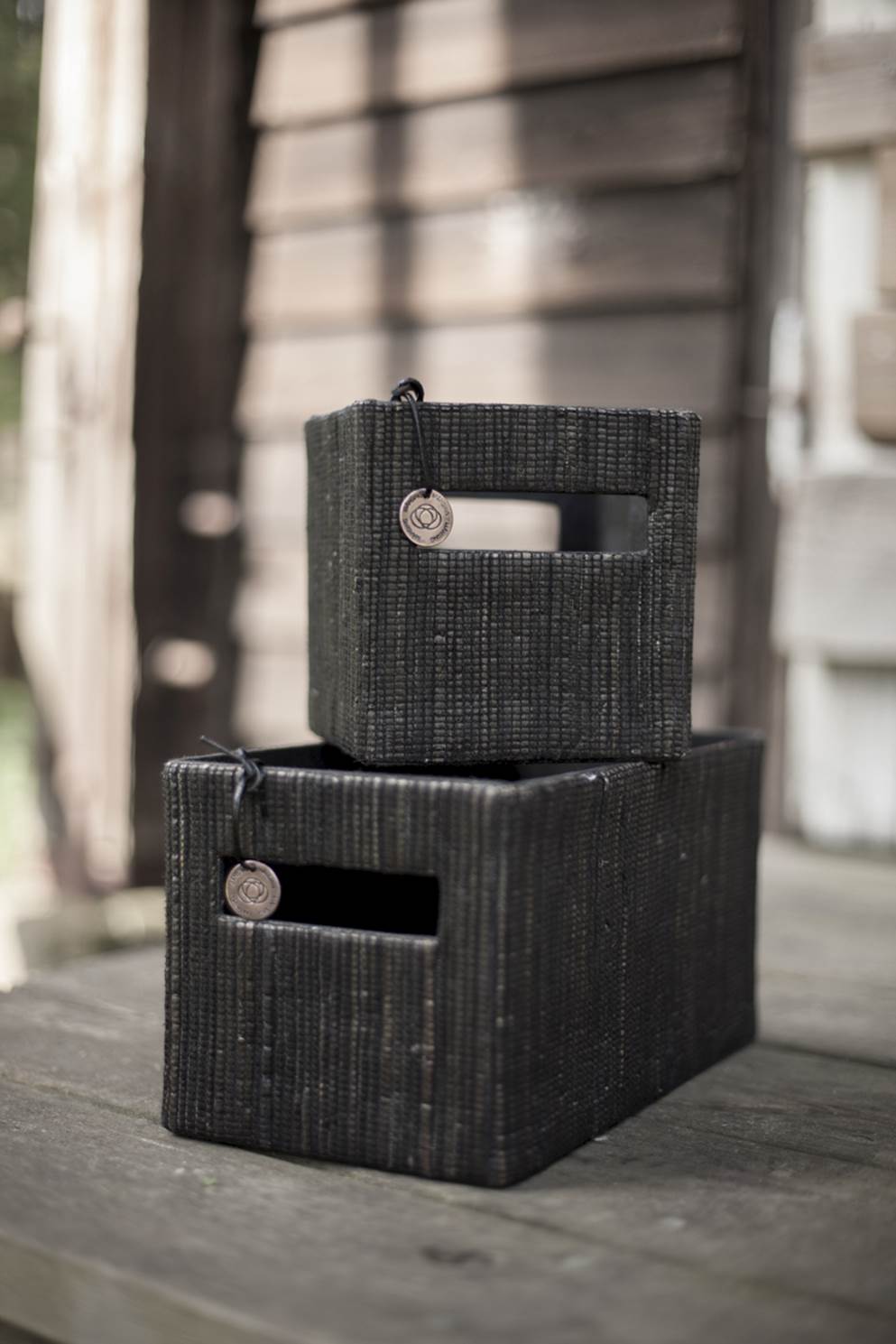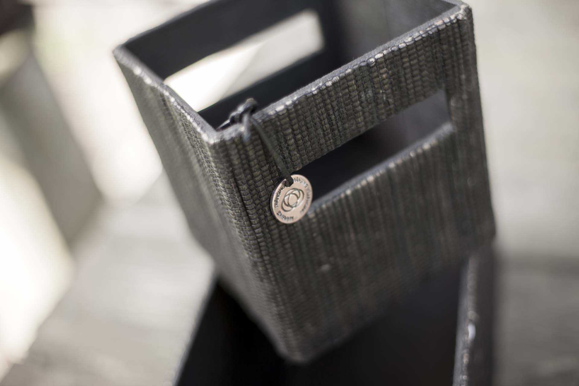 Det här är en hopvikbar förvaringsserie gjord av Vattenhyacint, en vattenväxt som skapar problem i sötvatten jorden runt. Den växer snabbt, kväver syretillgången och begränsar mängden dricksvatten. Men genom att ta upp och använda växten skapas nu arbetstillfällen i Indonesien. Fibrerna spinns och vävs för hand. Det leder till tryggad sysselsättning på landsbygden och inkomst för kvinnorna som snabbt lär sig hantverket vid vävstolarna. Samtidigt får vattenmiljön en chans att återhämta sig. Vi på Månsing gillar detta och njuter även av det textila uttryck som väven tillför den hårda lådan.