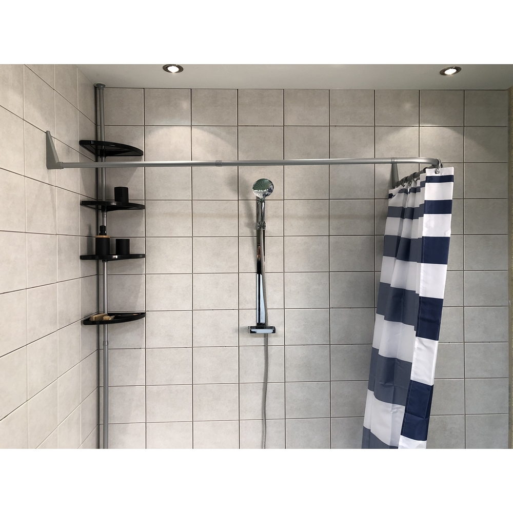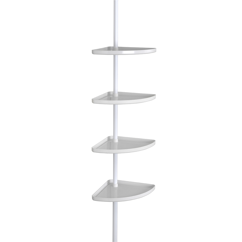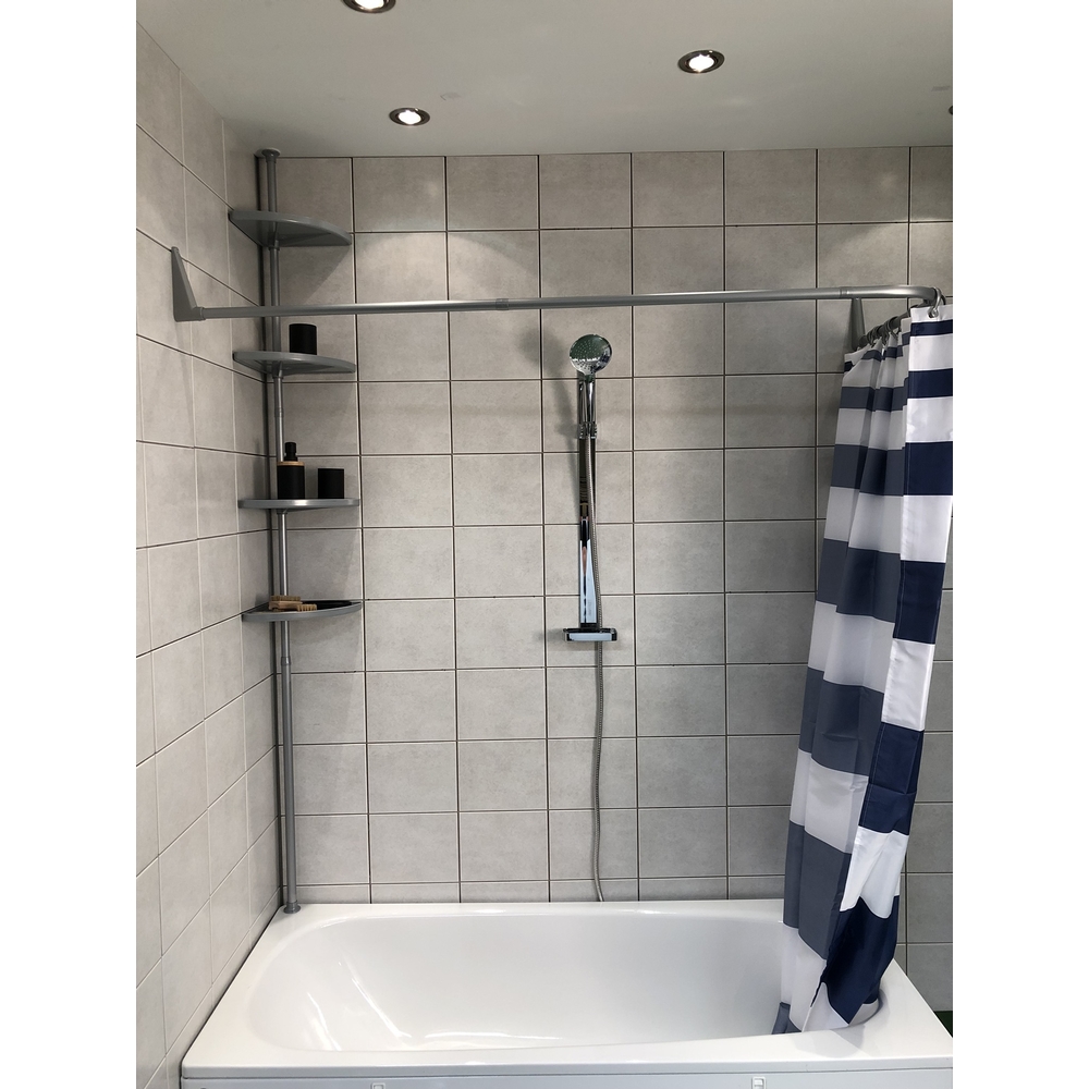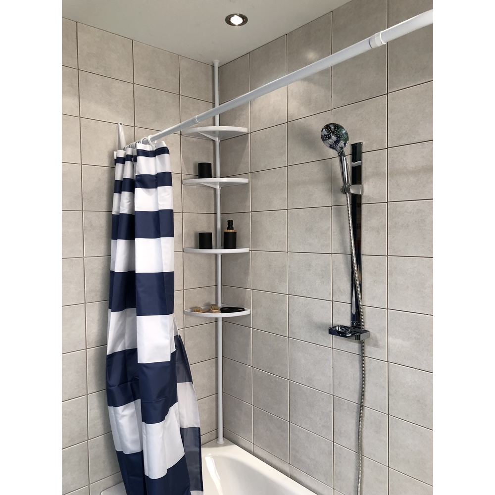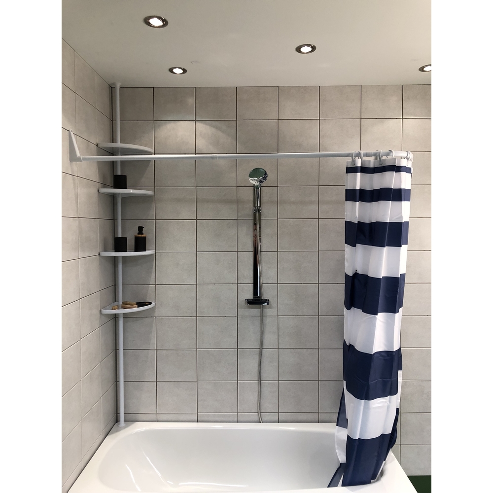 Hörnhyllan spänns enkelt mellan tak och golv eller varför inte skapa extra utrymme över badkaret genom att spänna hyllan mellan badkarskant och tak.