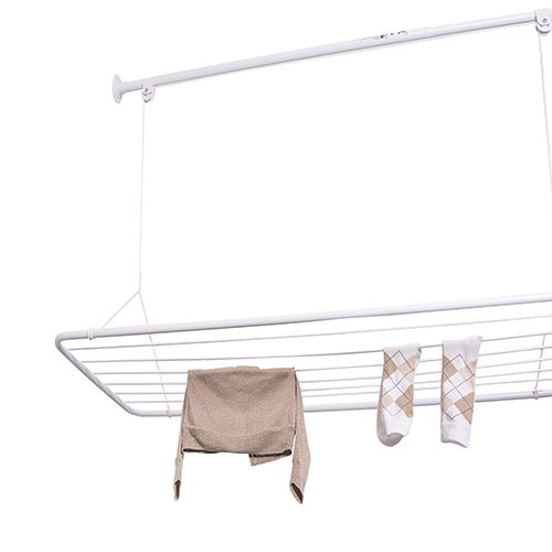 Väggmonterad Eric torkhiss levereras komplett med expanderstång 120-160 cm, inga borrhål i väggar behövs.
